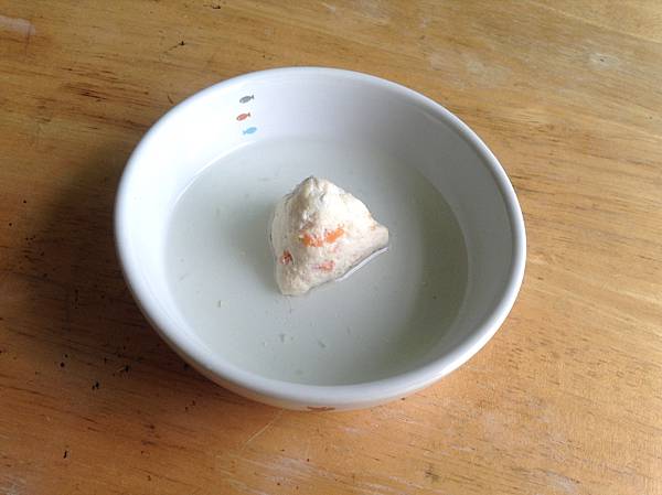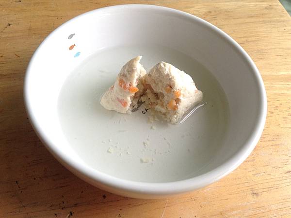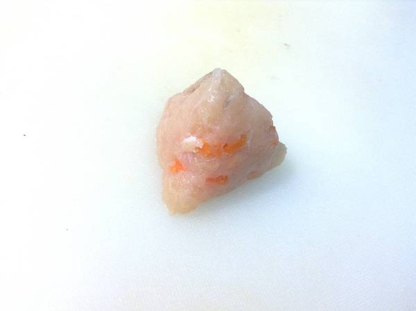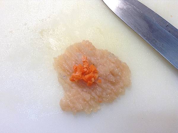 ▲把雞胸肉、吻仔魚跟紅蘿蔔都剁碎,摻在一起做撒尿牛丸……呃不,是雞肉粽子XD