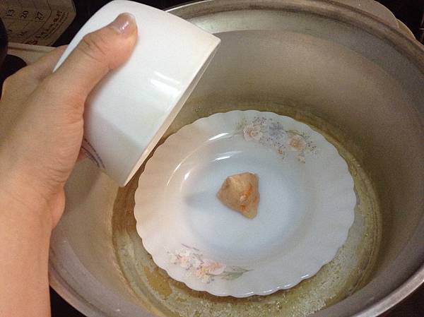 ▲同時放一顆之前做的干貝雞肉湯塊做為等會兒起鍋後的佐料